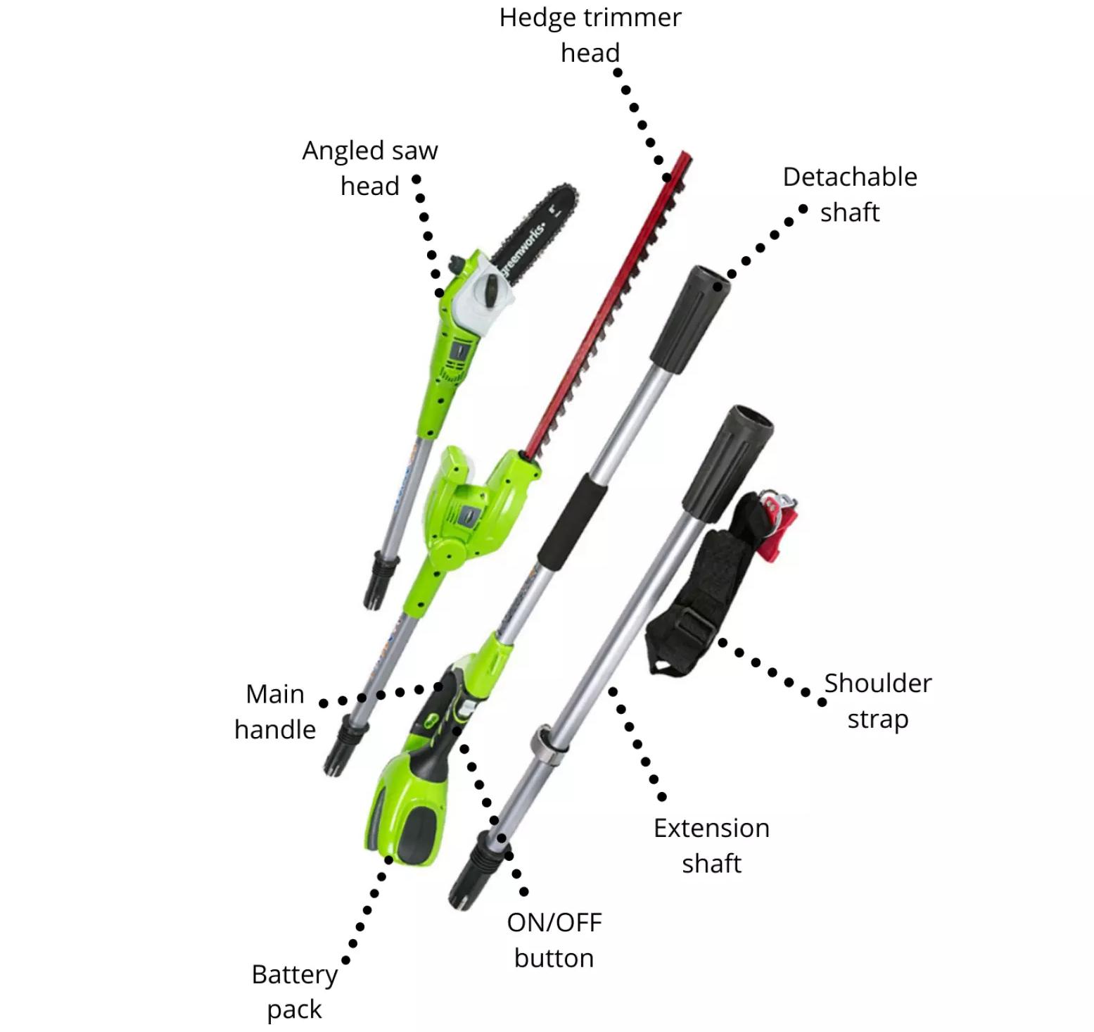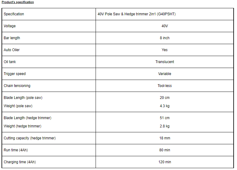 - G40PSHT is a Greenworks 40V battery branch saw and hedge trimmer on stem type which the users have one handle and two machines.