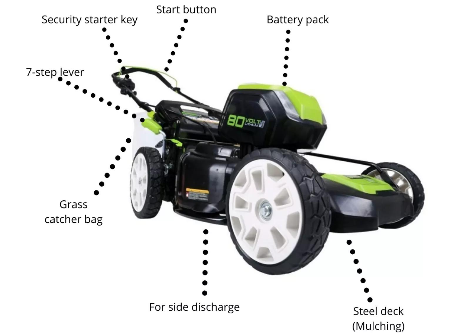 - Thanks to the 80 Volt Lithium ION battery, GD80LM53 has a long mowing time.